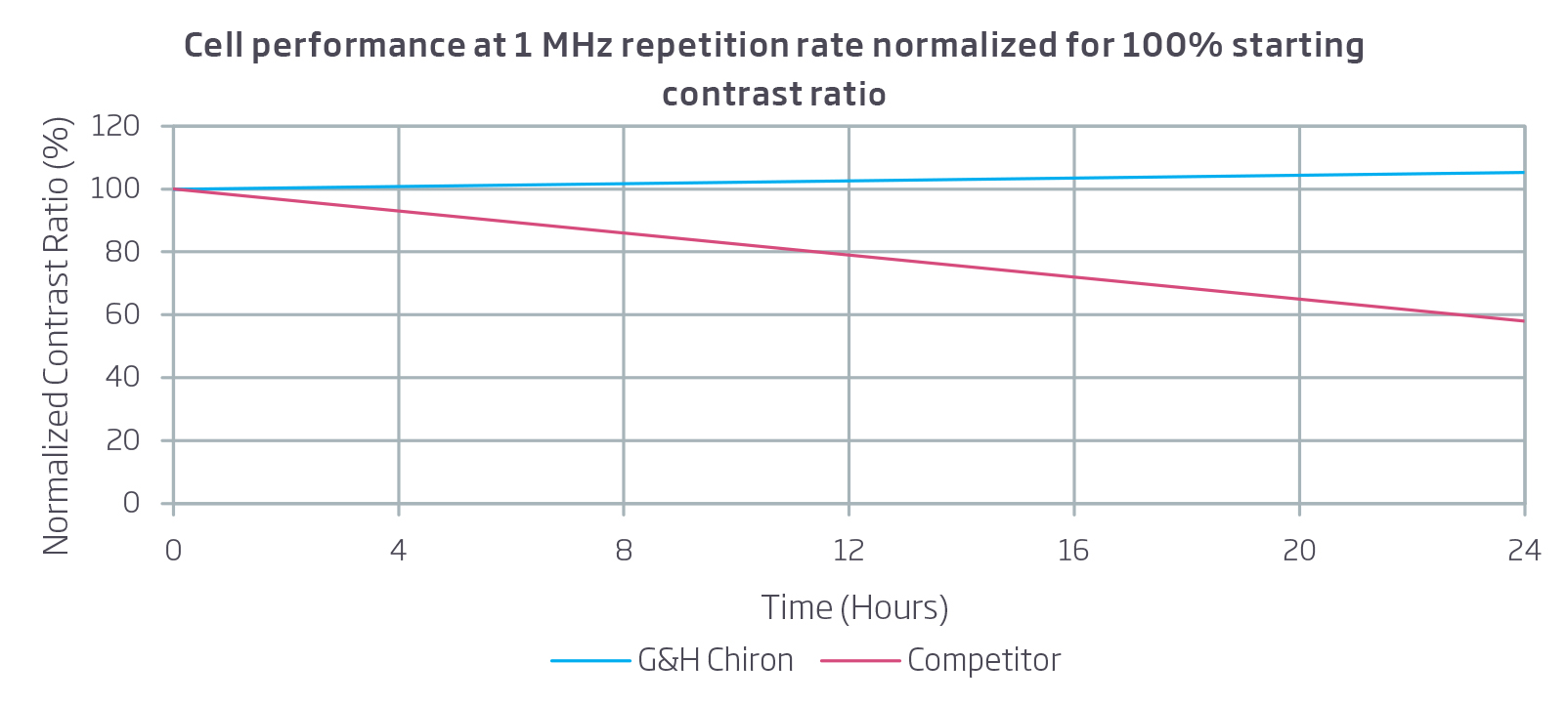 1MHz重復(fù)率下的普克爾盒性能標(biāo)準(zhǔn)化為100%的起始對(duì)比度