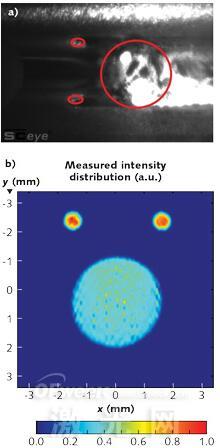 圖3:在釬焊熱鍍鋅材料時,材料表面上的三個光點(a),具有不同的直徑和功率密度(b)。利用光束整形鏡組,確保各個光斑彼此之間的位置和相對于焊絲的位置,不受加工頭的機械手臂在旋轉(zhuǎn)和定位時的影響。